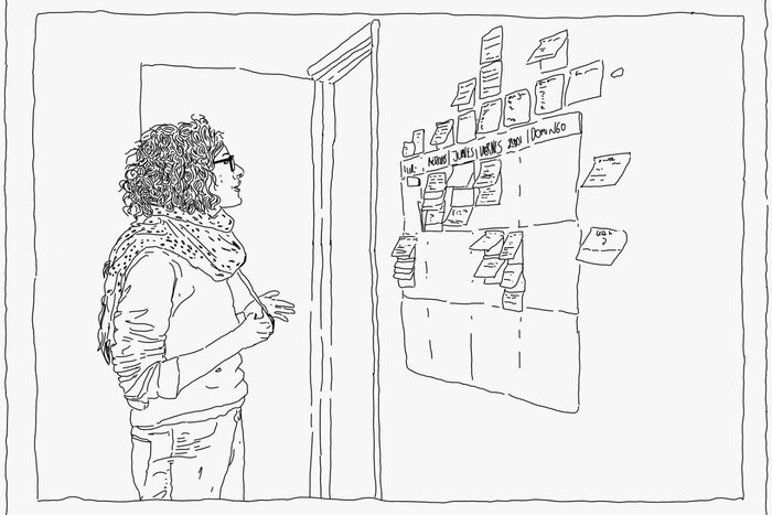 C: En general me gusta dibujar por periodos o bloques largos de tiempo, me funciona más armarme un mate y pasar horas dibujando en un solo día, que una constancia más diaria. Siempre fui una persona nocturna, así que por la tarde/noche suele ser mi mayor momento de productividad. Alterno entre música, podcasts o algún video de YouTube de fondo. Además, muy a mi pesar, trabajo mejor bajo presión, hija del rigor que le dicen.